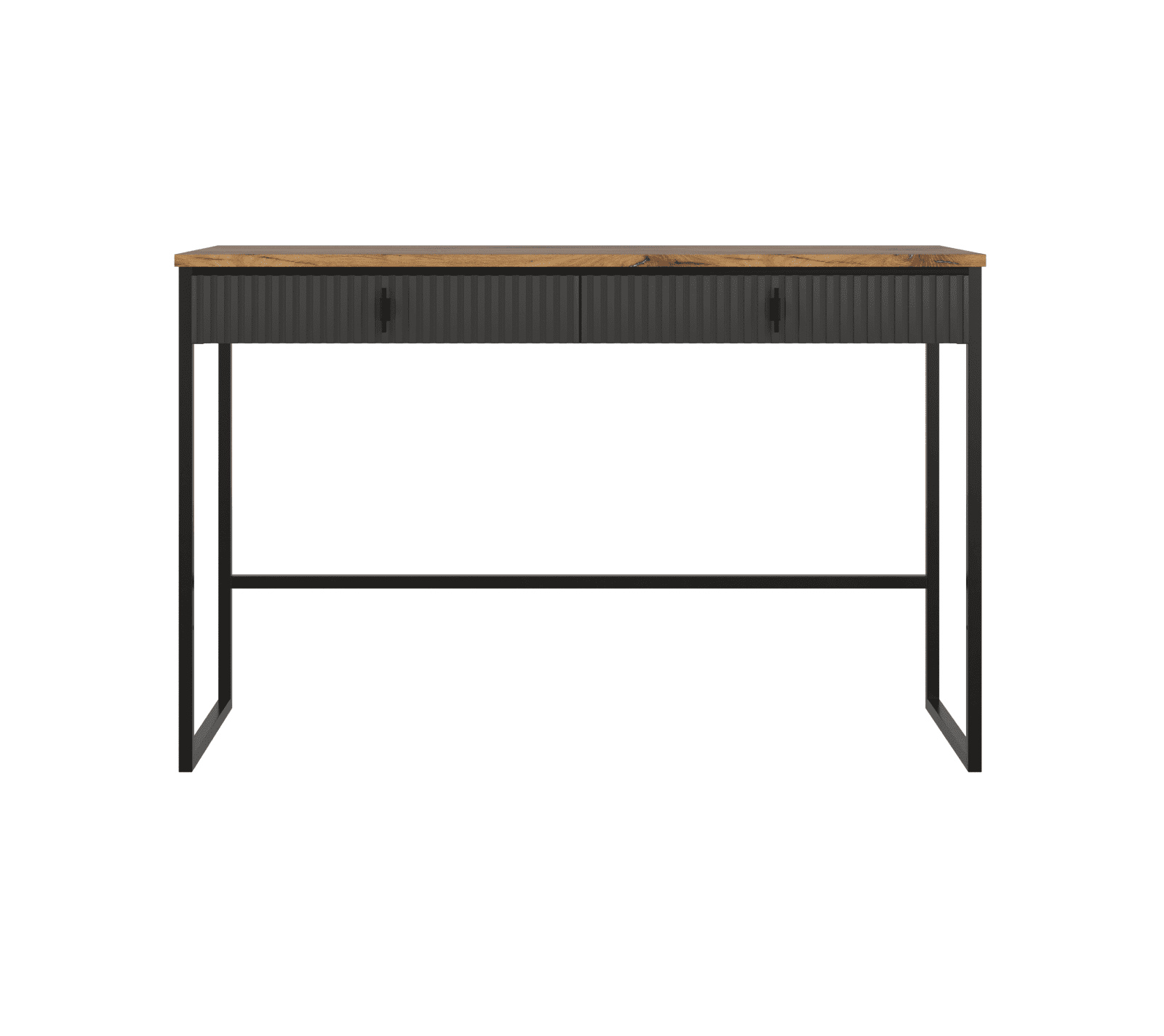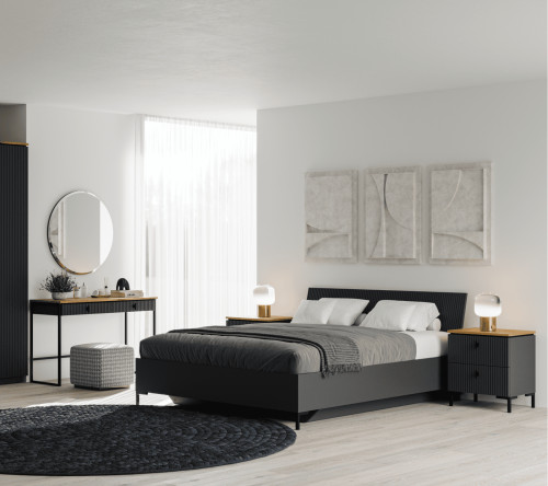 Сочетание темных матовых элементов и столешницы в цвете дуб нокс придают интерьеру глубину. Металлические ручки удобны в использовании. Благодаря фигурным опорам столик прочно стоит на полу.