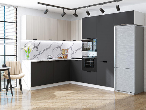 Кухонный гарнитур Евро Лайн-03 — это угловое решение для современной кухни, сочетающее стильный дизайн с высокой функциональностью. Размеры модели составляют 2140 х 2150/2800 х 600 мм, что позволяет гармонично вписаться в помещения различных размеров и планировок.
