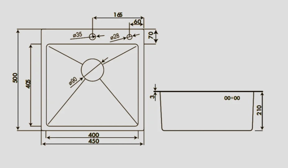 Мойка квадратная Practik PR-М 490 с отверстием под смеситель