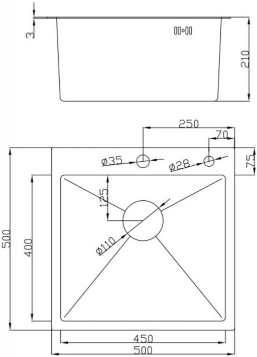 Мойка квадратная Practik PR-М 425 с отверстием под смеситель