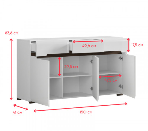 Комод имеет удобное сочетание ниш для хранения. Внутри вы можете разместить обувь, игрушки, книги, документы и одежду в стопках.