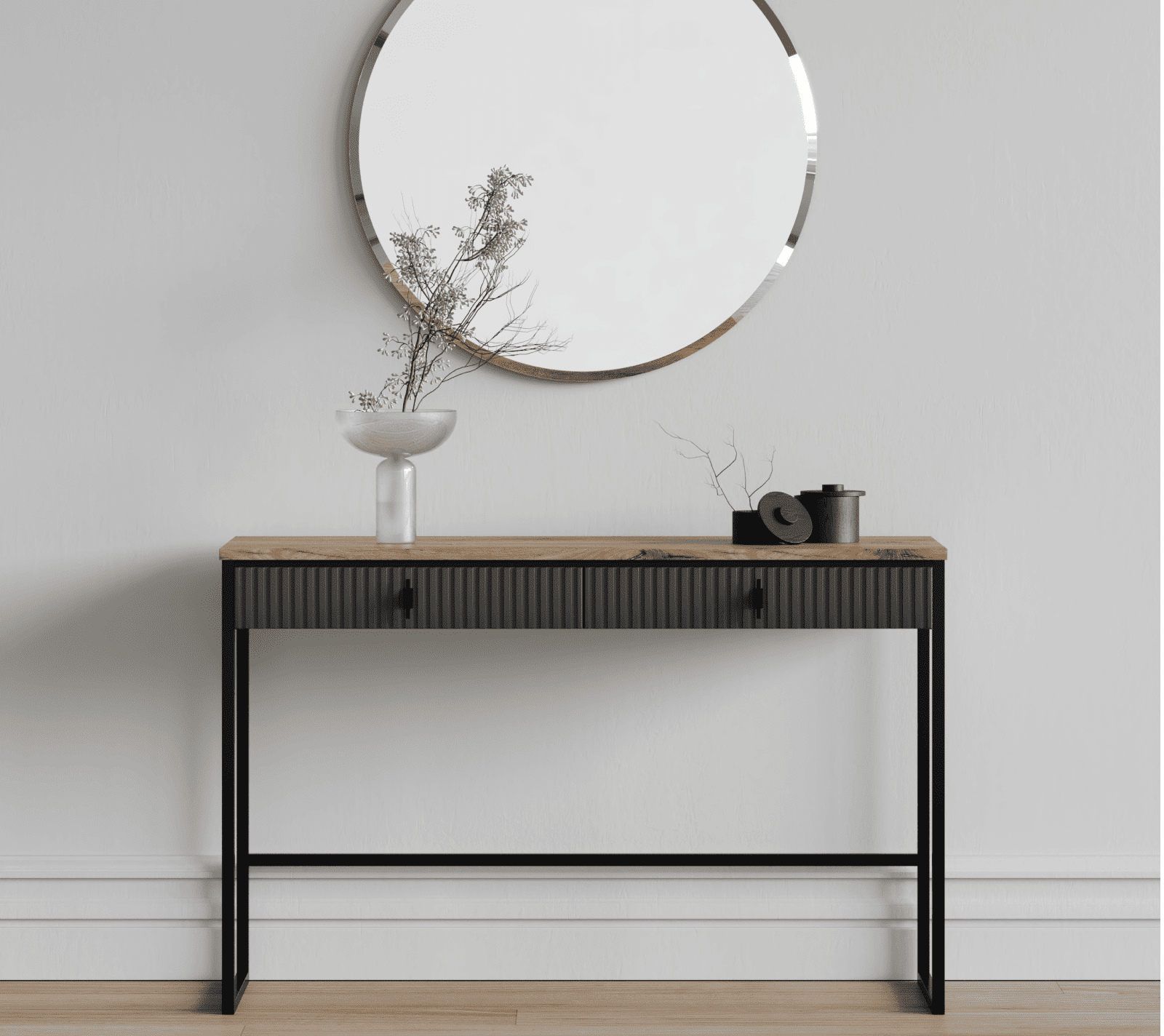 Сочетание темных матовых элементов и столешницы в цвете дуб нокс придают интерьеру глубину. Металлические ручки удобны в использовании. Благодаря фигурным опорам столик прочно стоит на полу.